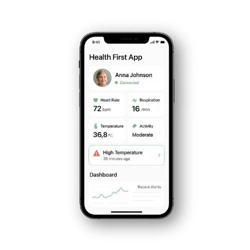 Meet hartslag, ademhaling en temperatuur via textielsensoren die volledig in de stof zijn verwerkt. Onopvallend, huidvriendelijk en betrouwbaar gedurende de hele dag.